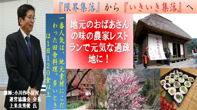 平成28年度第6回(通算116回)農山漁村コミュニティ・ビジネスセミナーは、(地元のおばあさんの味の農家レストランで元気な過疎地に!】と題して、宮崎県西米良村の小川作小屋村運営協議会の上米良秀俊会長をお迎えしました。