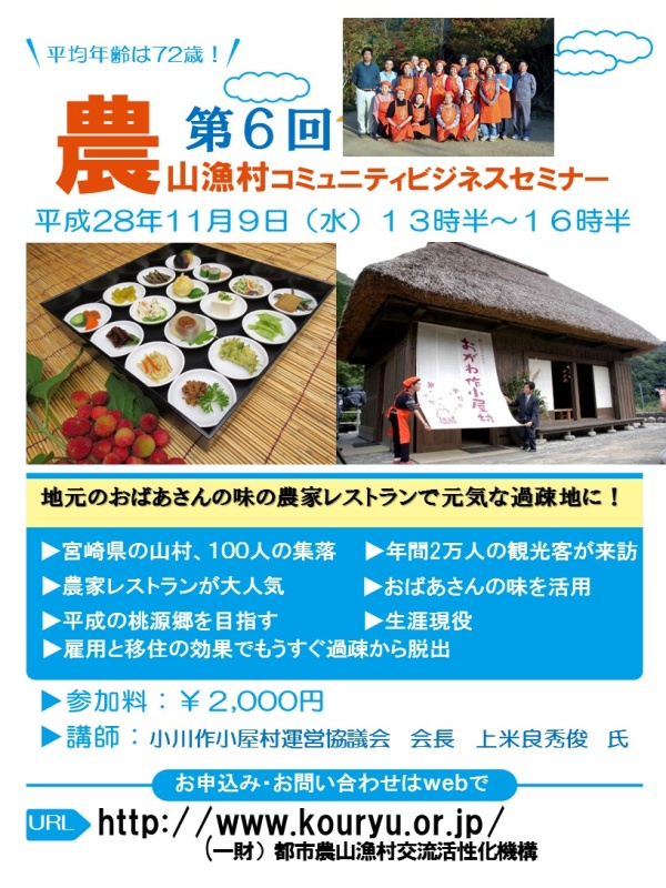 平成28年度第6回(通算116回)農山漁村コミュニティ・ビジネスセミナーは、【地元のおばあさんの味の農家レストランで元気な過疎地に!】と題して、宮崎県西米良村の小川作小屋村運営協議会の上米良秀俊会長をお迎えしました。